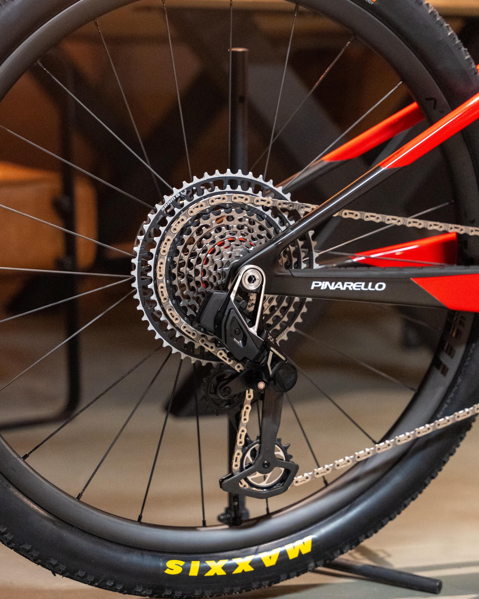 We started with the Pinarello Dogma XC in Pure Red, size L. This is the top-tier MTB frame from Pinarello, developed in collaboration with Tom Pidcock and Pauline Ferrand-Prévot. Its geometry is short and sporty, making it agile and responsive on the trails, while still maintaining stability. A fantastic foundation for any dream build.