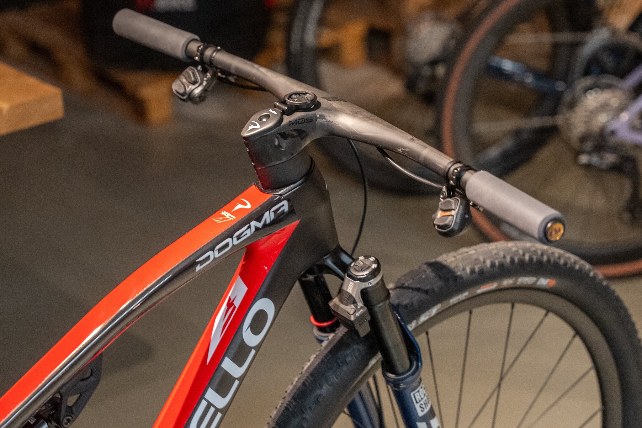 We started with the Pinarello Dogma XC in Pure Red, size L. This is the top-tier MTB frame from Pinarello, developed in collaboration with Tom Pidcock and Pauline Ferrand-Prévot. Its geometry is short and sporty, making it agile and responsive on the trails, while still maintaining stability. A fantastic foundation for any dream build.