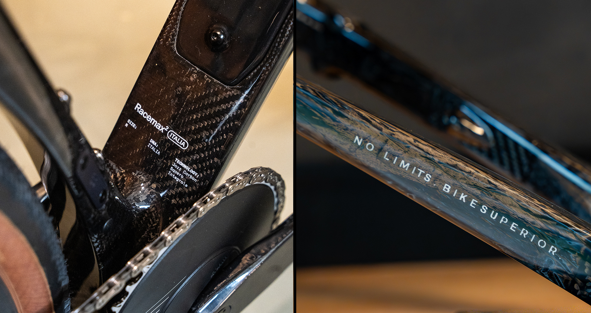 De No Limits Gloss is geen klassieke laklaag, maar een hoogglans primer met matte logo’s. Daardoor blijft de carbonstructuur zichtbaar en komen de lijnen van de RaceMax2 Italia extra mooi naar voren, zonder dat het geheel schreeuwerig wordt. In verschillende lichtomstandigheden oogt de fiets telkens net anders, maar altijd rustig en technisch.