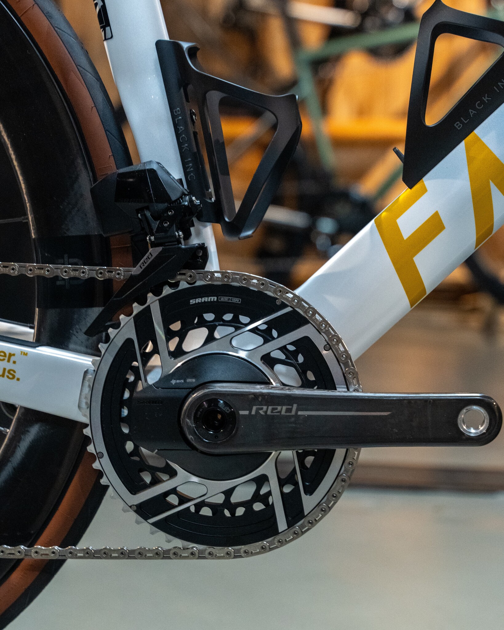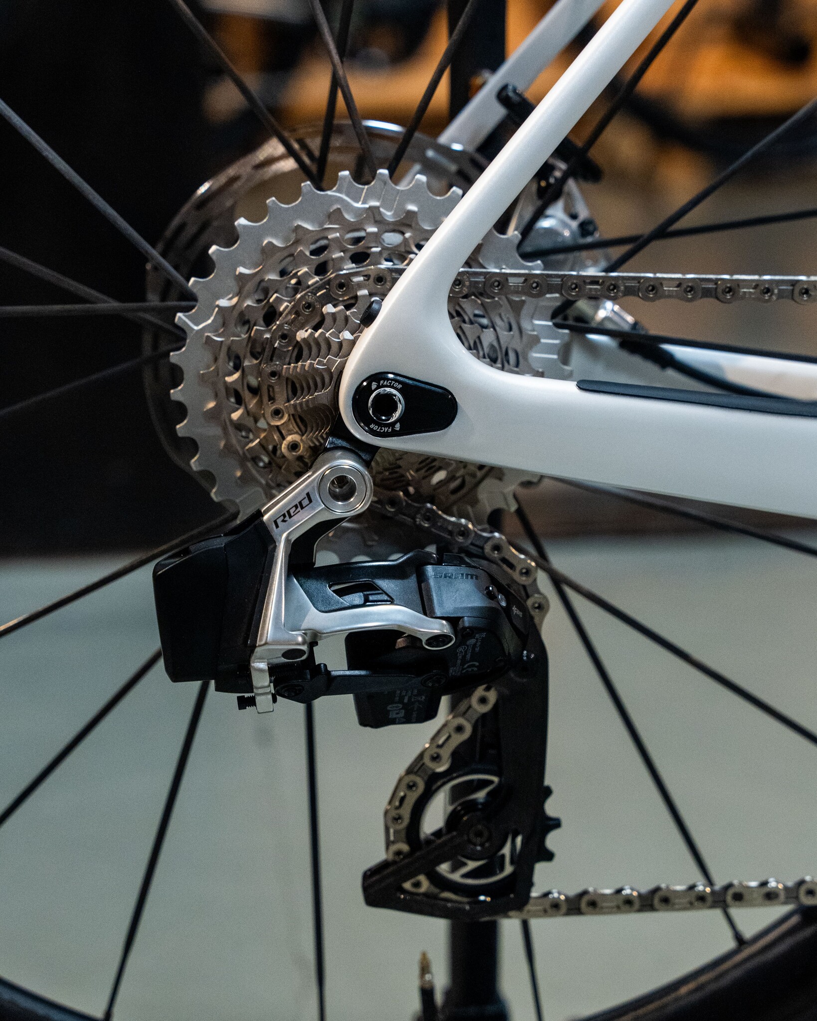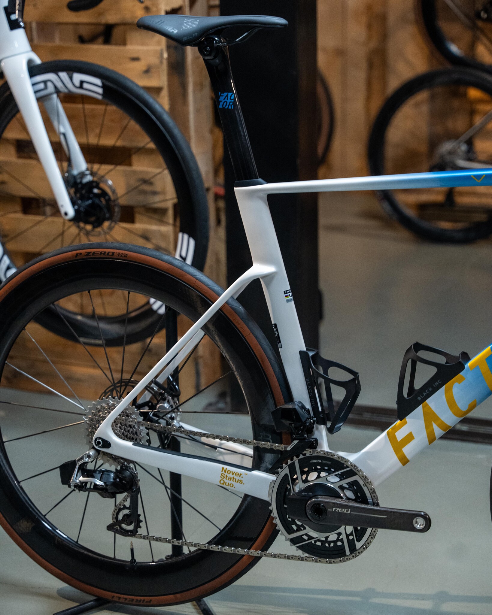 Onze klant wilde een lichte, snelle en opvallende racefiets. Hiervoor heeft hij gekozen voor de lichte en aerodynamische Factor OSTRO VAM 2.0 frameset met een opvallend custom lakwerk van Factor's Prisma Studio. Ook de Black INC Integrated Aero Barstem is aangepast met custom decals. Voor de groepset is gekozen voor de SRAM Red 2x12 AXS E1, gecombineerd met de Black Inc 48 | 58 wielen.
