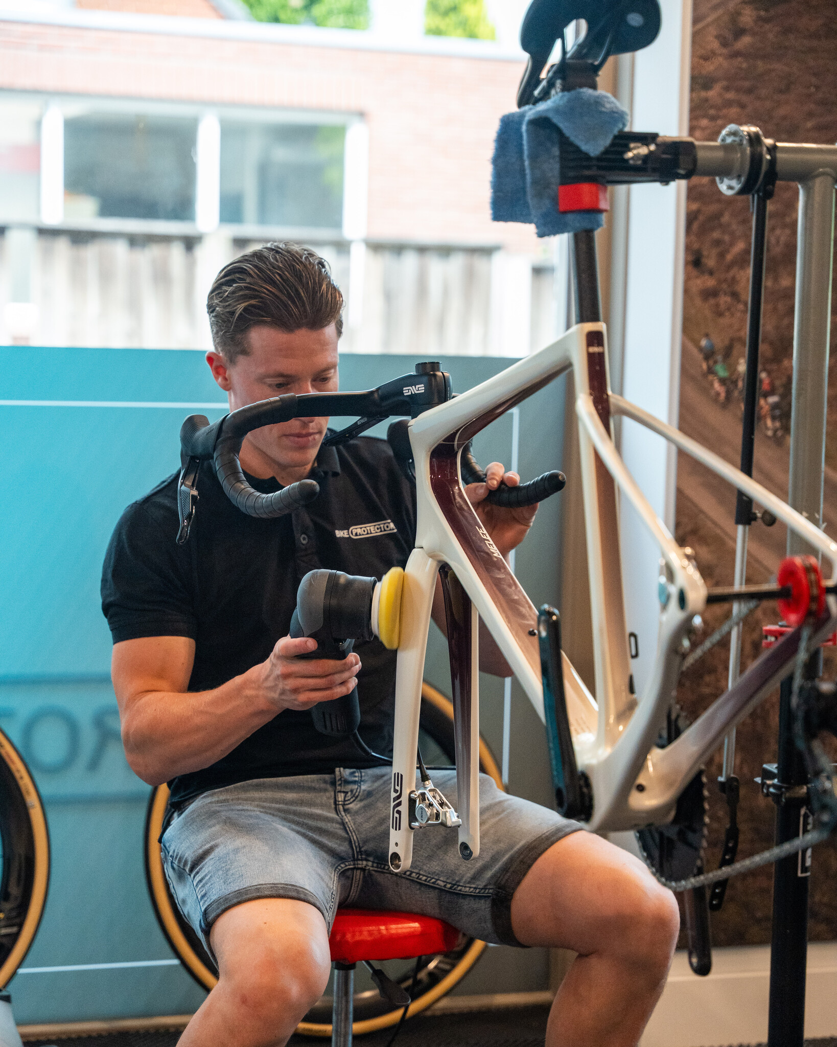 Om mijn fiets netjes te houden, heb ik hem laten voorzien van coating én PPF door Dion van BikeProtector. Geen zorgen over steenslag, geen doffe plekken door schoenwrijving of tasjes. En schoonmaken? Is nog nooit zo makkelijk geweest.