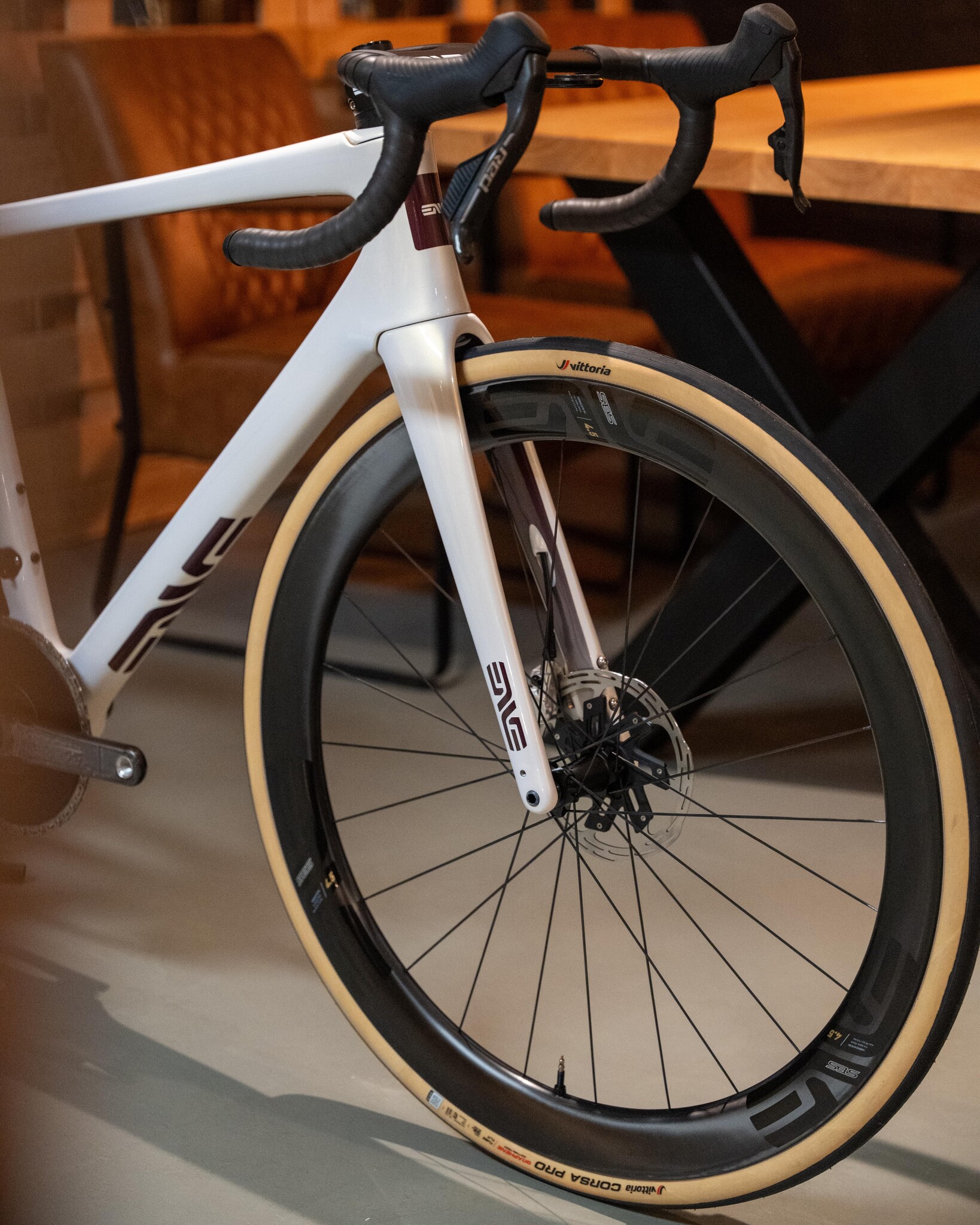 De wielen zijn ENVE SES 4.5’s: licht, stijf en snel. Een perfecte balans tussen aero en allround. Ze houden hun lijn goed, ook als het waait. Echt een set waar je zonder nadenken altijd mee kunt rijden. Banden: Vittoria Corsa 32 mm. Lekker soepel, snel genoeg en vooral comfortabel. Ik merk het meteen op klinkers of slecht asfalt: geen gehobbel, gewoon strak blijven rijden.