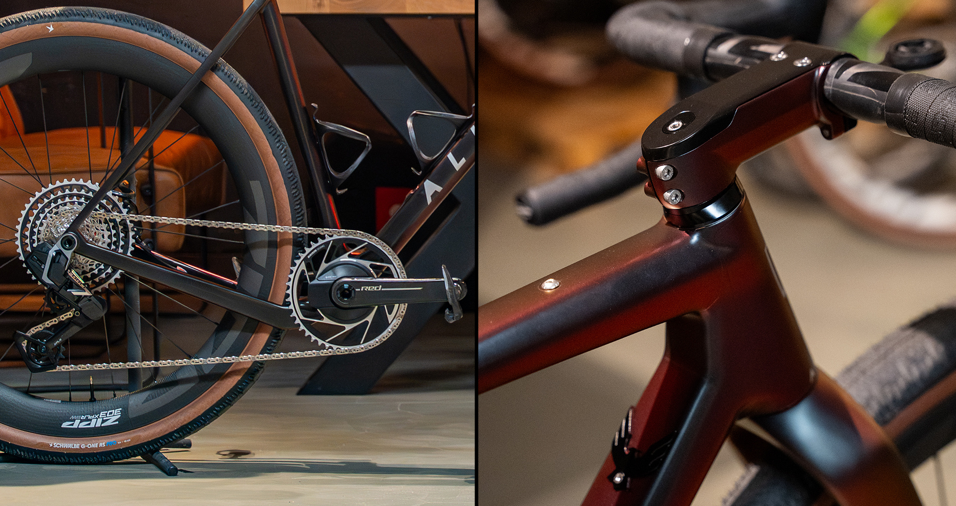 Ook de afmontage is volledig gekozen vanuit gebruik. De basis is een Allied Able frameset in maat 56, opgebouwd met een SRAM Force E1 XPLR 1x13 groepset. Eenvoud, betrouwbaarheid en een breed inzetbereik stonden daarbij centraal. In combinatie met een 46T kettingblad blijft de aandrijving efficiënt op snelle stukken, terwijl er genoeg bereik is voor lange klimmen en ruiger terrein.